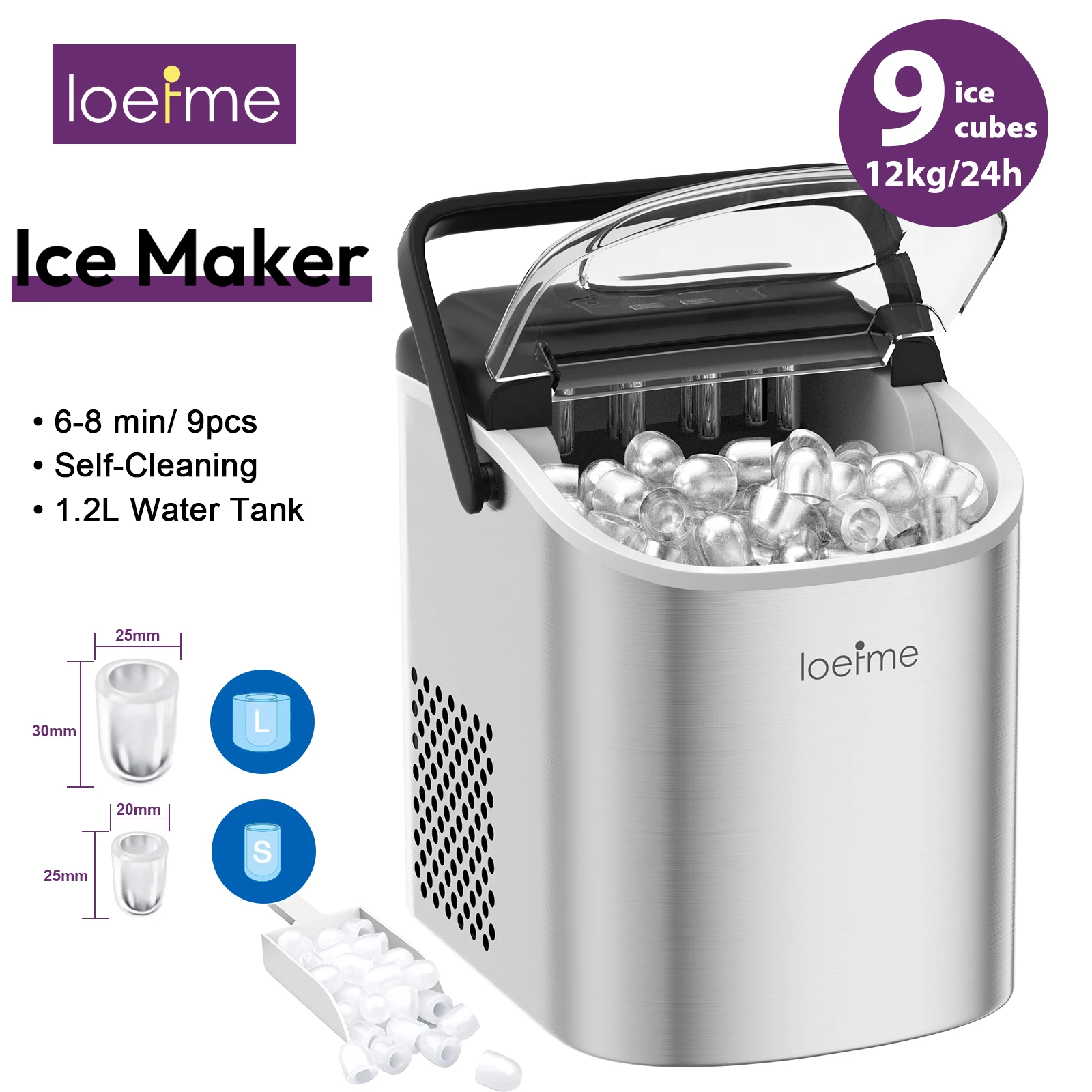 LOEFME 12KG/24H Przenośna, w pełni automatyczna maszyna do lodu w kształcie pocisków, zbiornik na wodę 1.2L, urządzenie do robienia lodu, 6 minut, 9 kostek lodu z łyżeczką