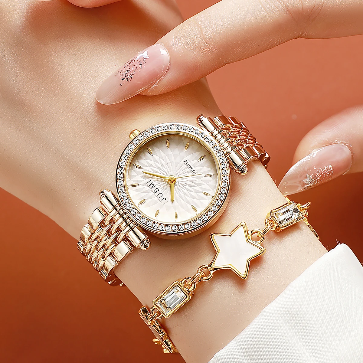 Zegarek damski na co dzień, uniwersalny, bez pudełka prezentowego, z diamentami, angielski zegarek, łańcuszek z gwiazdką, zestaw 2-częściowy.