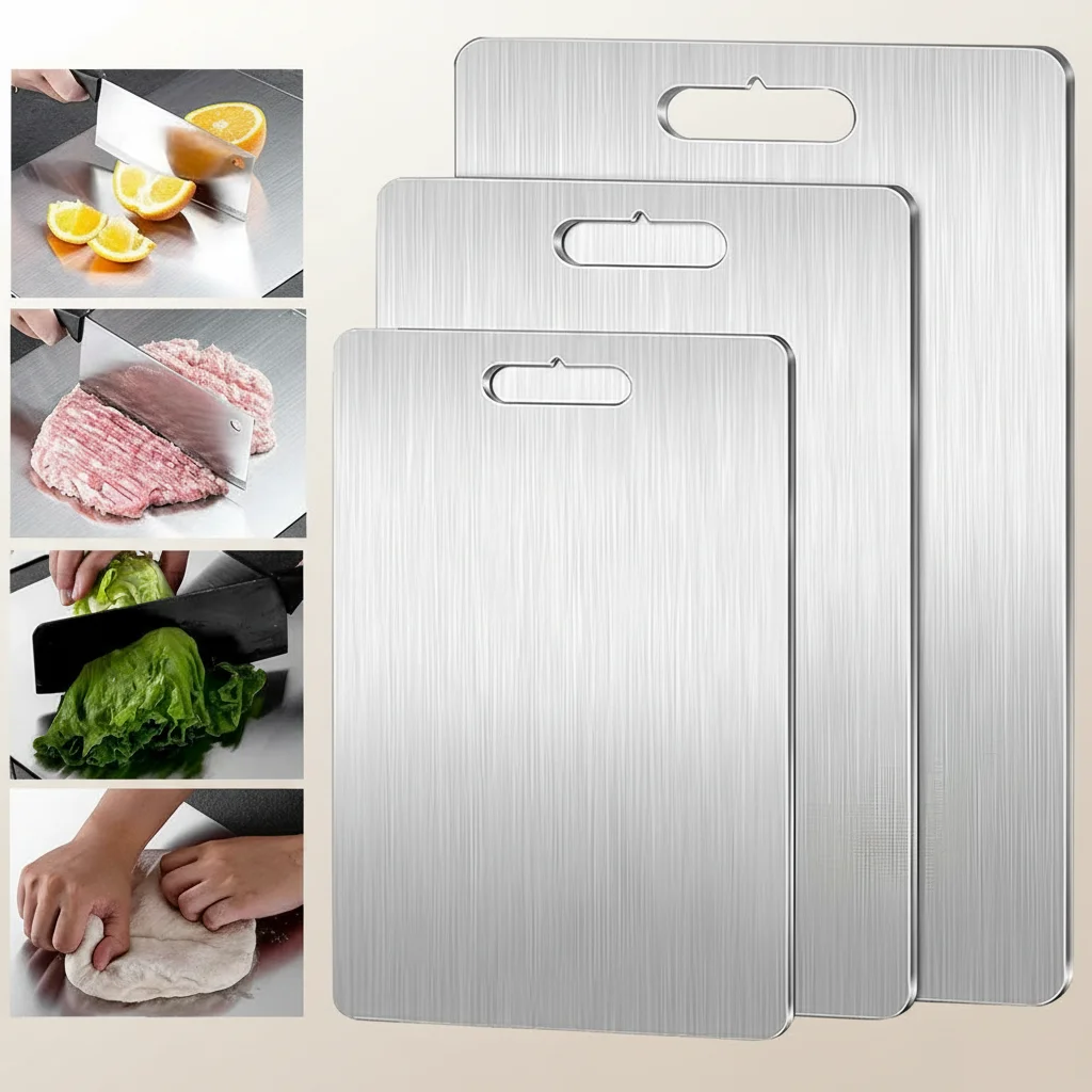 Deski Tnące z Tytanu do Kuchni Nierdzewna Blacha Stal 304 Wzmocniona Dwustronna Klasa Żywności Taśmowa Przenośna Do Krojenia Owoców i MięsaBezpieczny Wytrzymały Przenośny Wielofunkcyjny Antypoślizgowy Łatwe w Użyciu