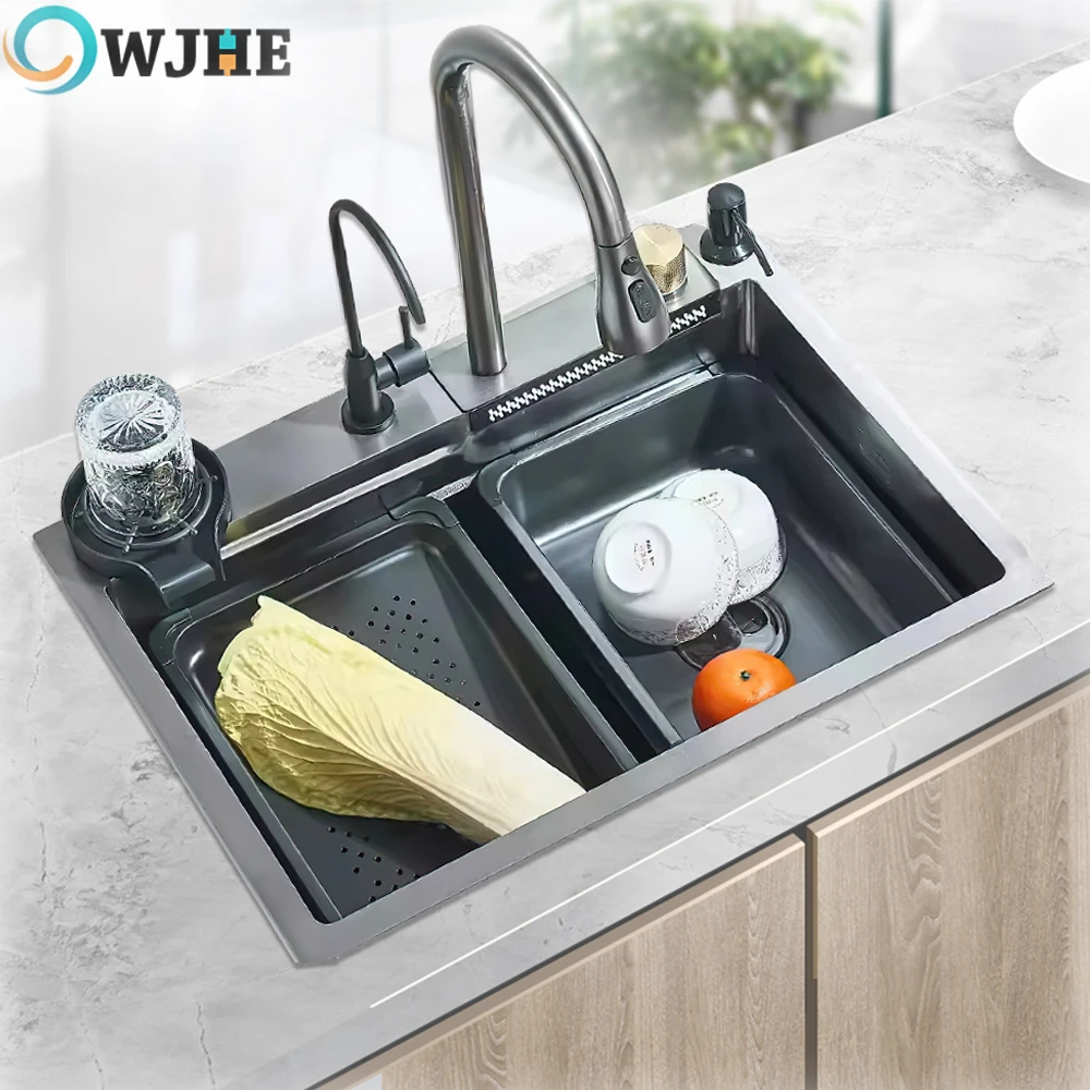 Zlewozmywaki kuchenne z wyświetlaczem cyfrowym, jednokomorowe, ze stali nierdzewnej, z wylewką wodospadową, cyfrowe zlewozmywaki kuchenne, kran kuchenny cyfrowy z wyciąganą wylewką, ciepła i zimna woda.