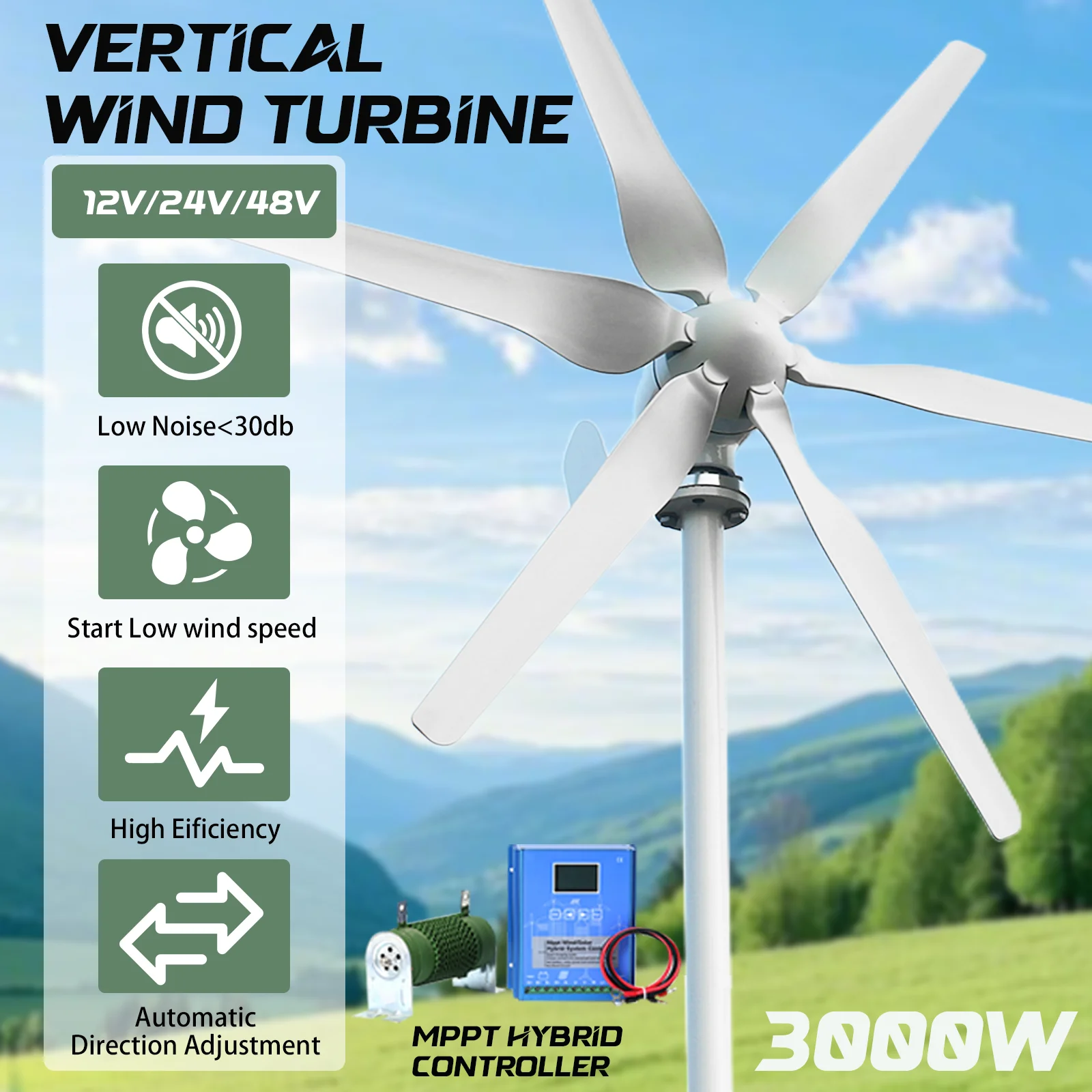 Zestaw generatora turbiny wiatrowej 3000W 12/24/48V z 6 łopatkami, mały wiatrak, z hybrydowym kontrolerem wiatro-słonecznym, do użytku domowego, na farmę, energia wolna.