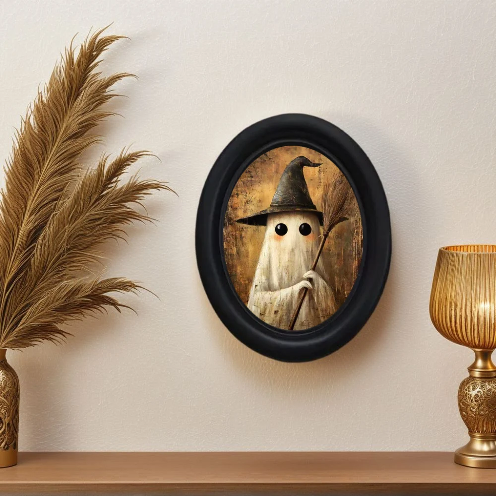 1 sztuka vintage'owego, gotyckiego, wiktoriańskiego muralu - Mały duch w czapce czarownicy trzymający miotłę, owalny drewniany znak dekoracyjny, ręcznie robiony nadruk transferowy, odpowiedni do dekoracji ścian w domu i biurze, dekoracja świąteczna, 4. 16X 5. 25 cali, dekoracja ścienna