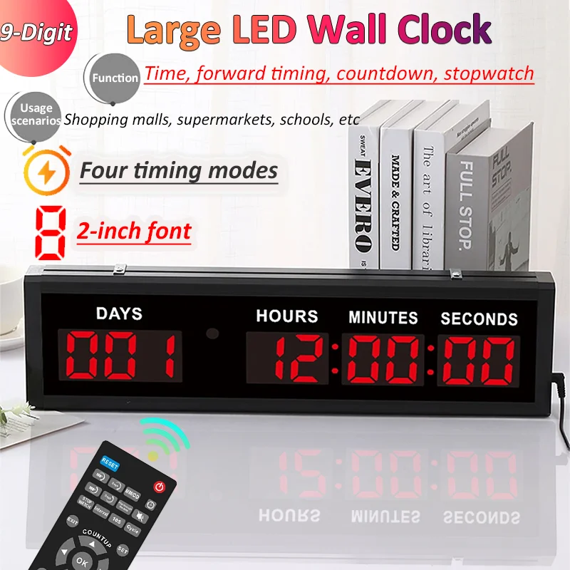 Zegar ścienny LED z dużym wyświetlaczem 2 cale, 9-cyfrowy budzik, pilot zdalnego sterowania, timer do odliczania/policzania, cykliczne odmierzanie, do użytku w szkole, na siłowni.