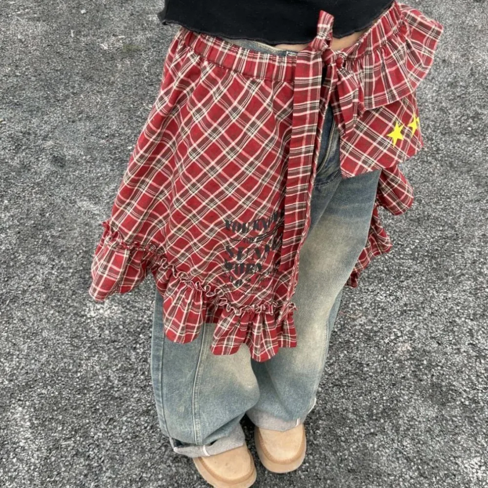 Stroje Star Layer, spódnica w kratę, hip-hop, słodki sznurowany szal na biodra, koszula w stylu koreańskim, przedłużacz do koszuli, falbaniasta krawędź, ozdoba do spodni jeansowych.