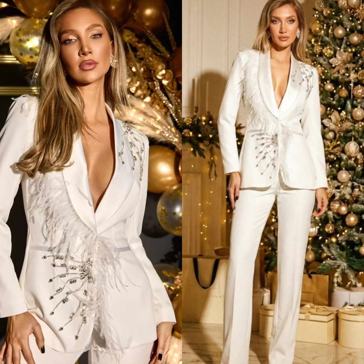 Eleganckie damskie komplety z piórami, zapinane na jeden guzik, z długim rękawem, spodnie, zdobione koralikami, dwuczęściowe, na przyjęcie urodzinowe, szyte na miarę.