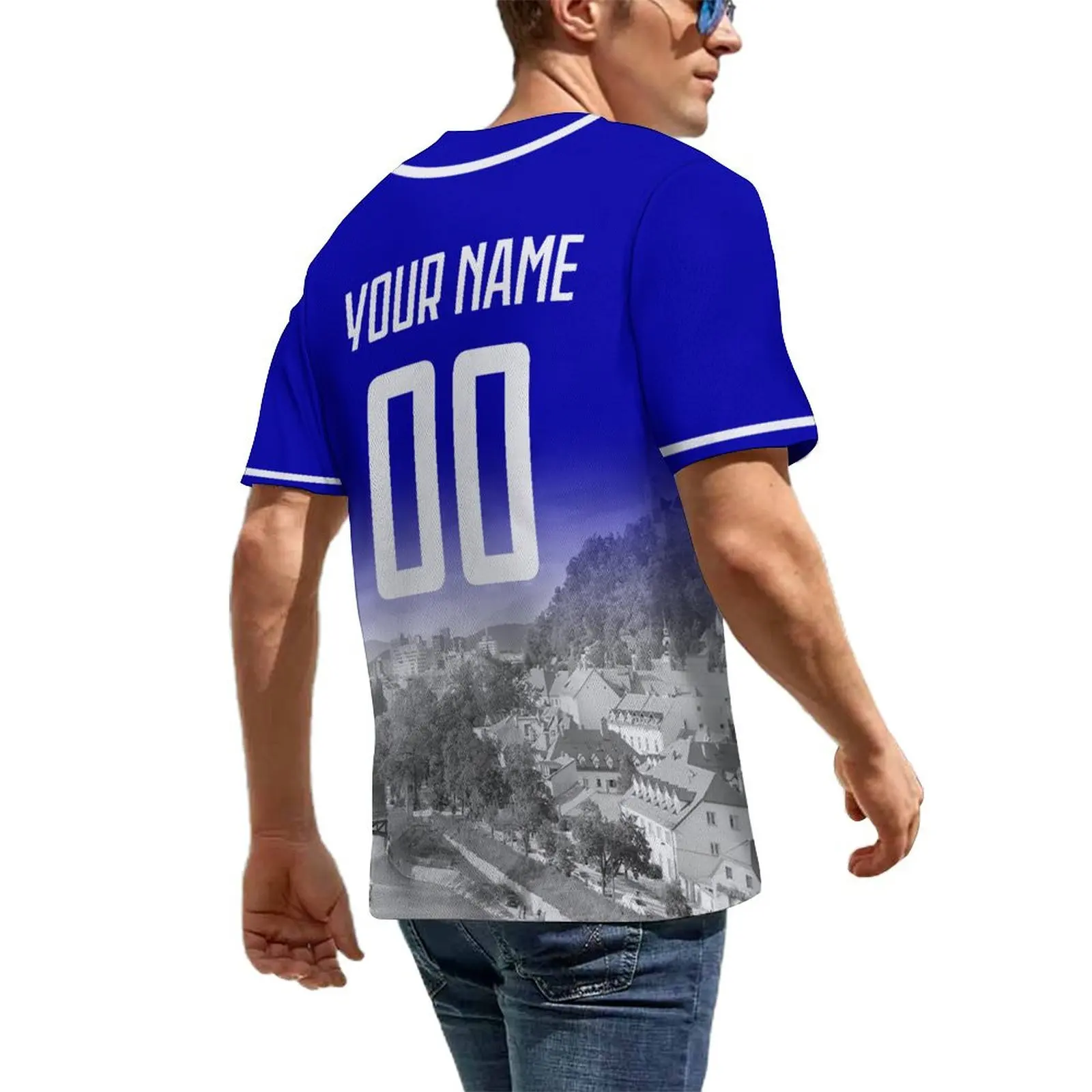 Męska koszulka baseballowa Słowenia z własnym nadrukiem, personalizowana nazwa i numer, wygodna koszulka z widokiem na miasto w nocy, prezent dla fanów baseballu.