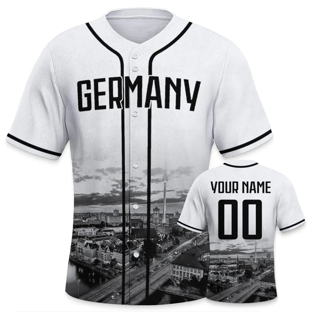 Męska koszulka baseballowa z niemieckim motywem, personalizowana imieniem i numerem, wygodna koszulka z widokiem na nocne miasto, idealna na prezent dla fanów baseballu.