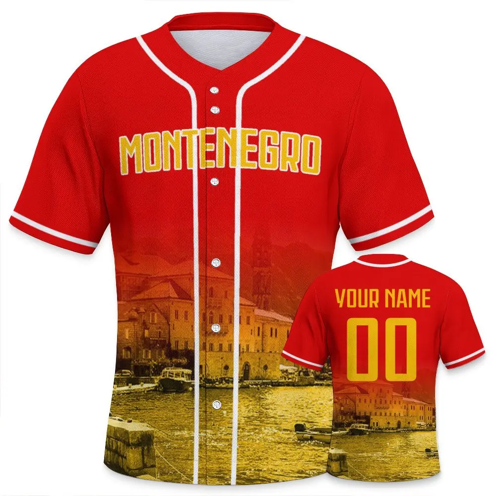 Męska koszulka baseballowa z personalizacją (imię i numer) z motywem Czarnogóry, wygodna koszulka z widokiem na nocne miasto, idealna na prezent dla fanów baseballu.