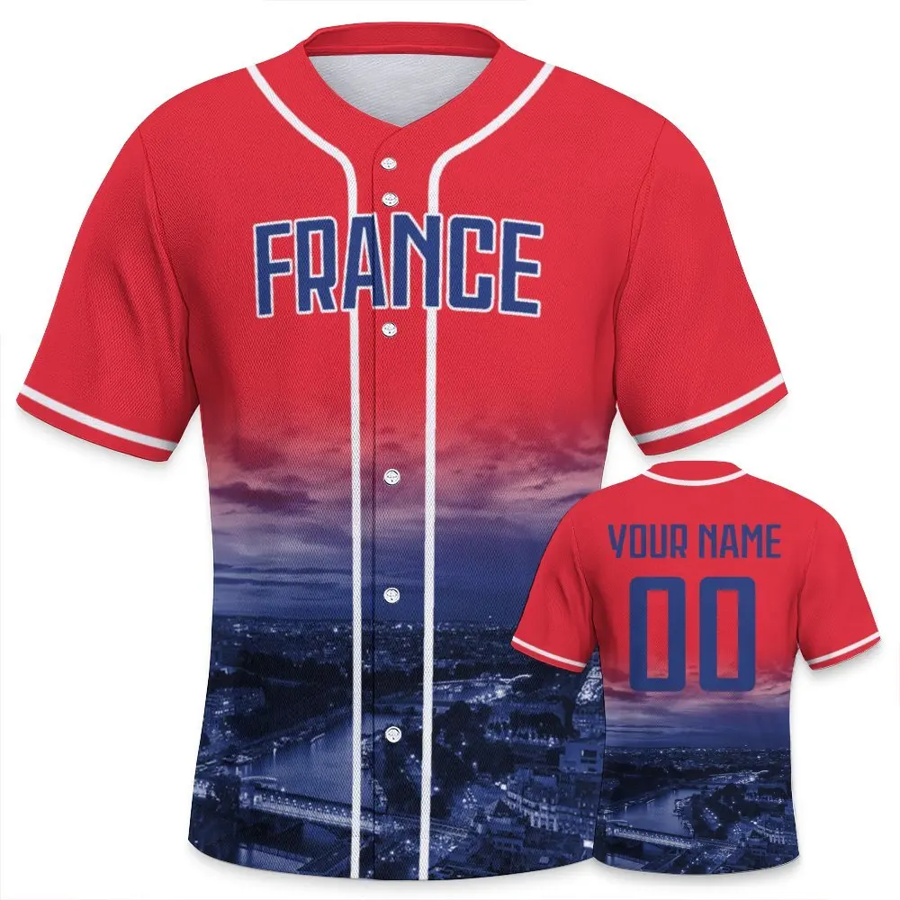 Męska koszulka baseballowa Francja z własnym nadrukiem, personalizowana nazwa i numer, wygodna koszulka z widokiem na nocne miasto, prezent dla fanów baseballu.