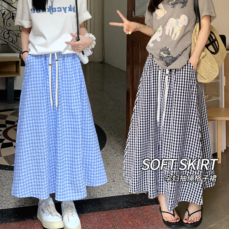 Odzież ciążowa nowa letnia spódnica w kratę typu bubble, codzienna, wyszczuplająca, drapowana, o średniej długości, z dużym zamachem, w kształcie litery A, spódnica typu parasol.