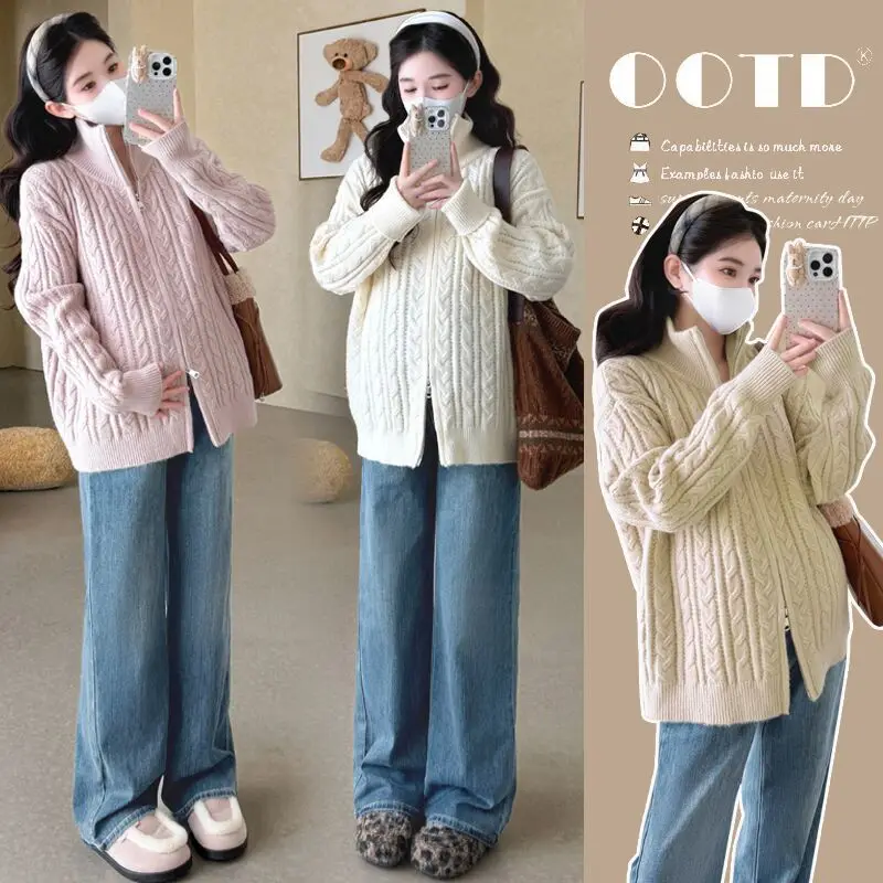 Sweter ciążowy Jesień Zima 2026 Prosty, swobodny, miękki, wygodny, luźny sweter z kołnierzykiem i zamkiem błyskawicznym dla kobiet w ciąży.