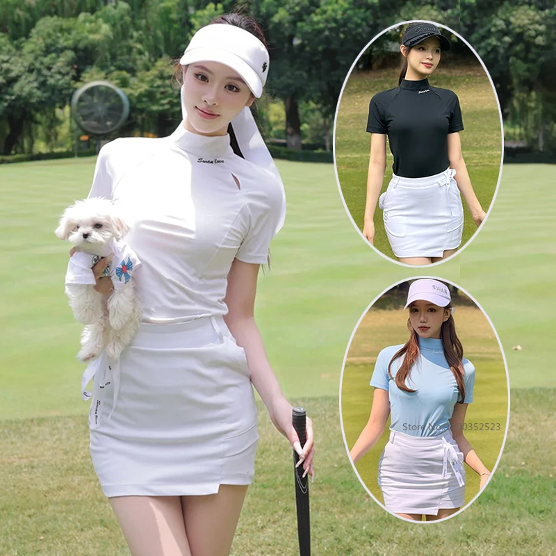 Damska odzież golfowa SG, koszulki golfowe z szybkoschnącego materiału z stójką, koszulki tenisowe z krótkim rękawem, damska spódnica golfowa o kroju ołówkowym z małą torebką i szortami.
