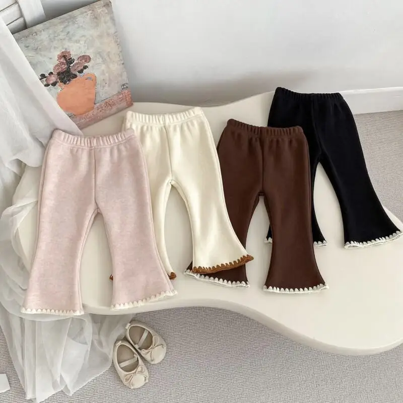Jesienno-zimowe ciepłe spodnie dla dziewczynek, jednolite, z rozszerzanymi nogawkami, grube, z elastyczną talią, wygodne ubrania dla dzieci w wieku 1-3 lat.