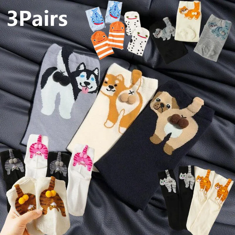 3 pary zabawnych skarpetek 3D z motywem szczeniaków dla kobiet, wiosenno-jesienne, urocze skarpetki do połowy łydki z kreskówkowymi kotami i psami, skarpetki unisex z motywem psa i jajka, ciekawe.
