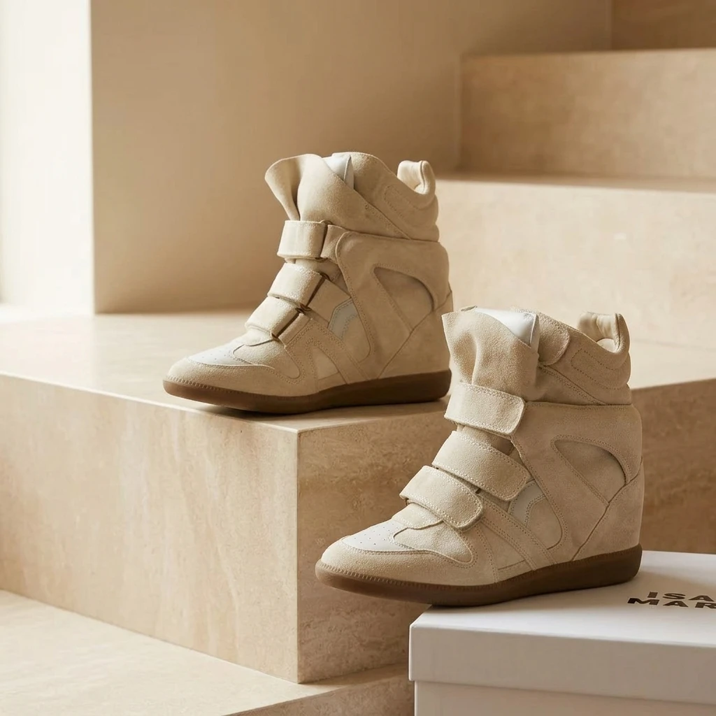 Damskie sneakersy na koturnie z wysoką cholewką, zamszowe botki na koturnie z zapięciem na rzepy, antypoślizgowe modne buty sportowe na koturnie do noszenia na co dzień i w stylu streetwear.
