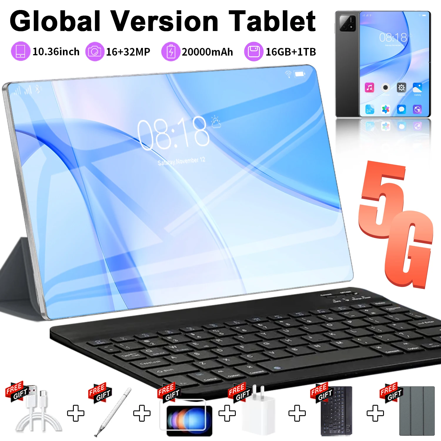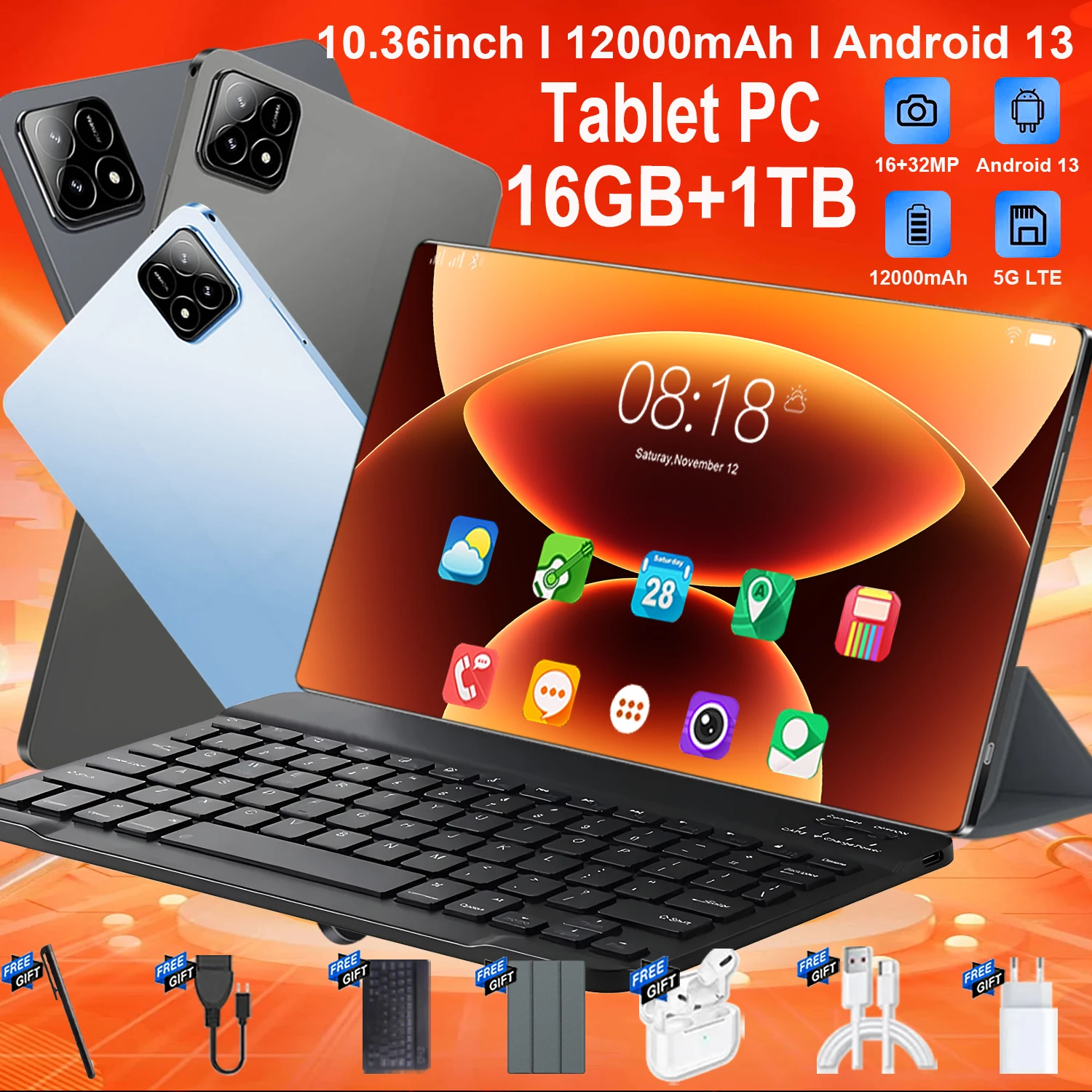 Tablet Android PRO6 2026 Nowy 5G 10-rdzeniowy Tablet Gamingowy Tablet Biurowy Dual SIM Dual Camera WIFI Bluetooth G, 16GB+1TB, 12000mAh