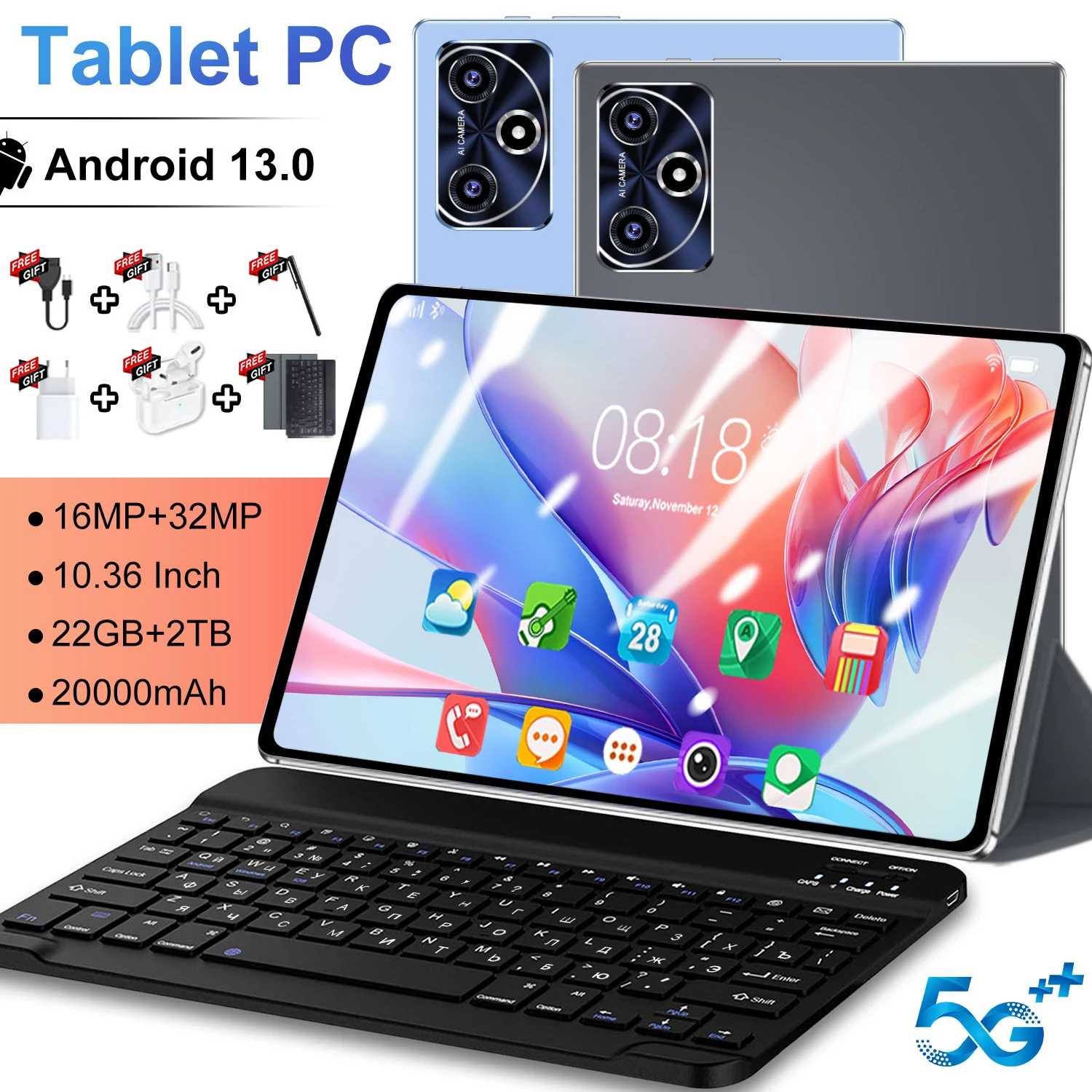 Tablet Android 5G z dwoma kamerami, SIM, Bluetooth, Android 13, 14 rdzeni, Google Play, Tablet PC, 16GB + 1TB ROM