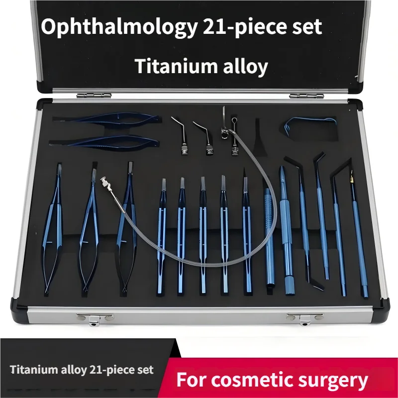 21 szt. Zestaw okulistyczny do operacji katarakty i wewnątrzokularnej chirurgii, instrumenty chirurgiczne do mikrochirurgii oka, narzędzia ze stopu tytanu do powiek