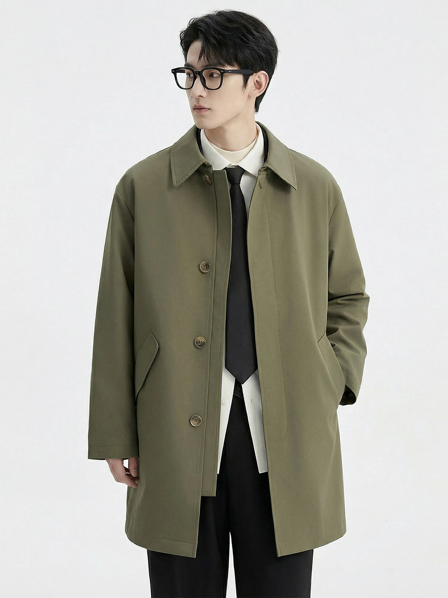 Męski płaszcz w stylu vintage, wojskowy, w kolorze zielonym, średniej długości, z kołnierzem z sztruksu, wykonany z czystej bawełny, jednorzędowy, na wiosnę i jesień.