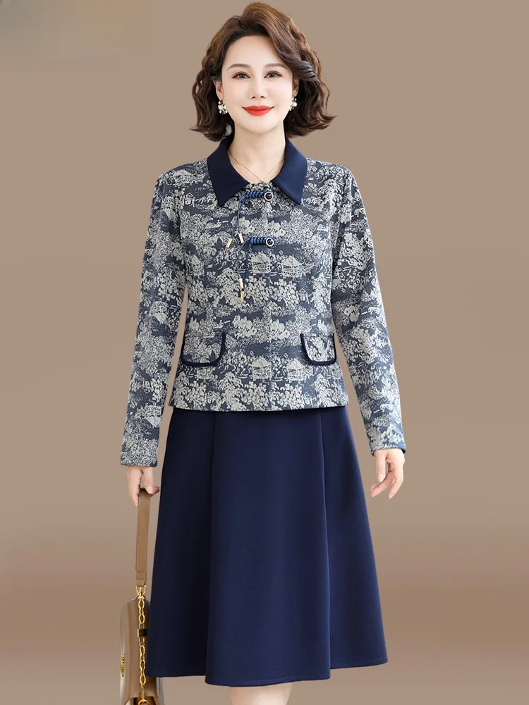 Retro Niebieski Zestaw Dwuczęściowy Damski Jesienny Nowy Elegancki Wysokiej Jakości Uniwersalny Sweter Przeciwstarzeniowy z Kołnierzykiem i Długim Rękawem