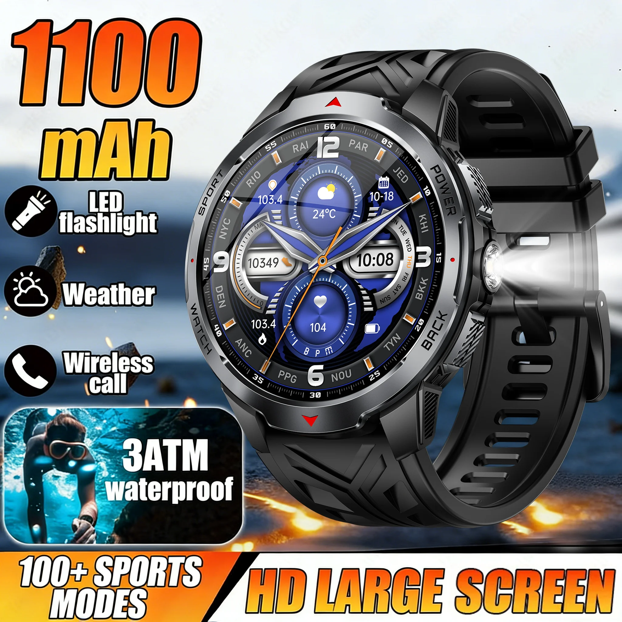 Nowe smartwatche męskie 2025 o militarnym standardzie, 1000Ah, wodoszczelne 3ATM, z funkcją połączeń BT, ponad 100 trybów sportowych, idealne na prezent dla mężczyzn.