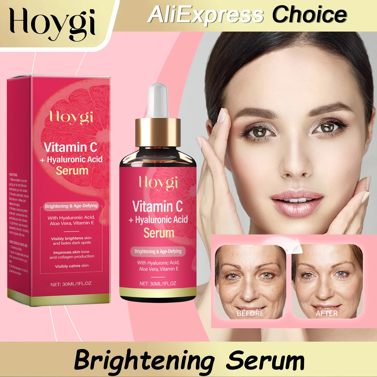 HOYGI Serum do twarzy z kwasem hialuronowym i witaminą C, nawilżające, regenerujące, rozjaśniające, na matową skórę, esencja do twarzy, krem przeciwstarzeniowy, nawilżający.