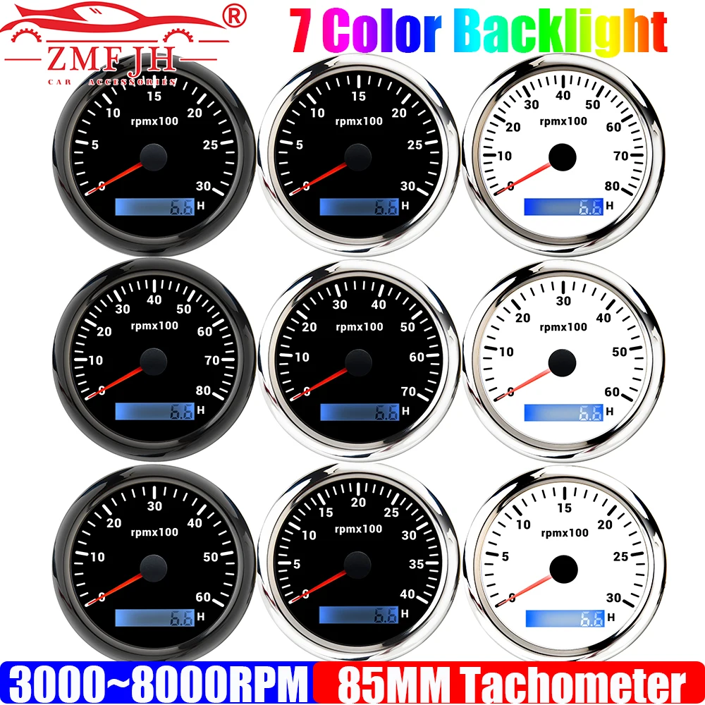 80mm 3-1/8" Licznik REV z Podwójnym Wyświetlaczem, 7 Kolorów Podświetlenia, Tachometr z LCD i Licznikiem Motogodzin 0~8000RPM do Silnika Jachtu, Łodzi, Samochodu