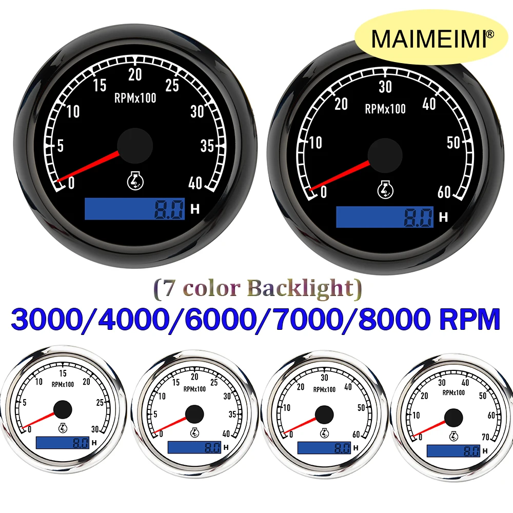 80mm 3-1/8" Licznik REV z Podwójnym Wyświetlaczem, 7 Kolorów Podświetlenia, Tachometr z LCD i Licznikiem Motogodzin 0~8000RPM do Silnika Jachtu, Łodzi, Samochodu