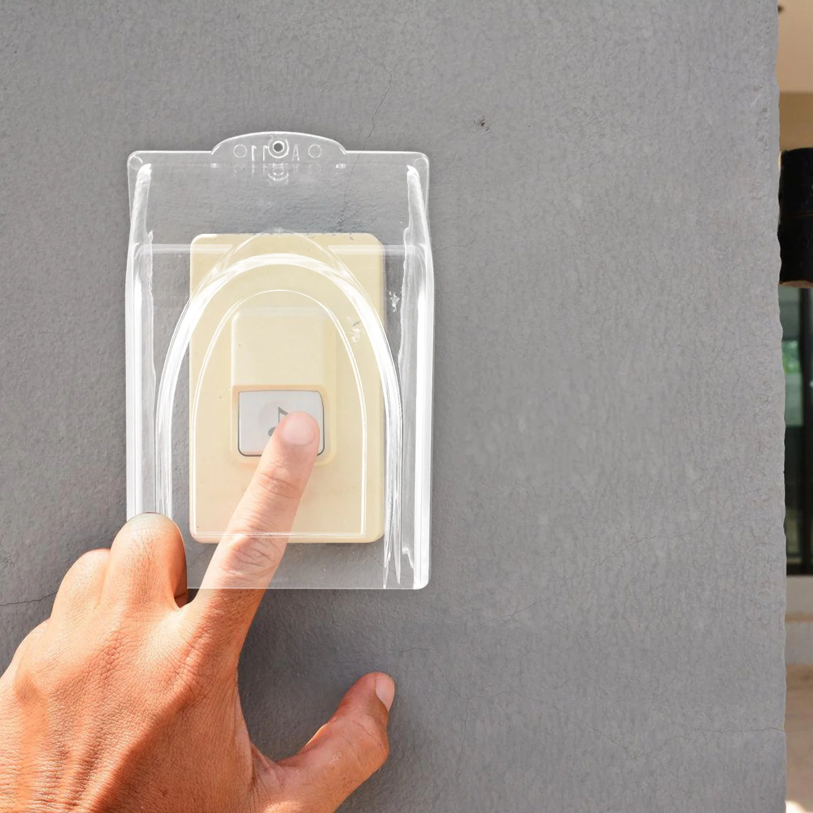 Osłona dzwonka do drzwi przezroczysta, zewnętrzna, chroniąca przed deszczem, wykonana z tworzywa sztucznego zapewniająca trwałość i widoczność, bez potrzeby montażu.