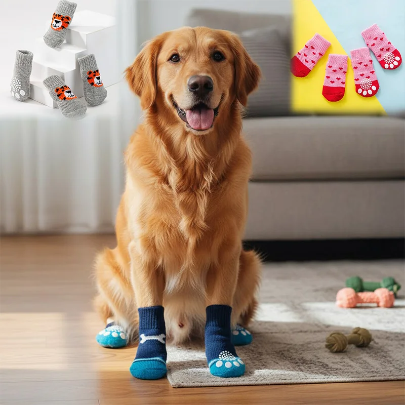 4 szt./zestaw Antypoślizgowe dziergane skarpetki dla psów z motywem tygrysa, ciepłe buty do noszenia w domu dla szczeniąt i kotów, grube ochraniacze na łapy dla małych i średnich psów