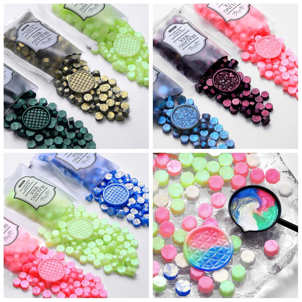 100 sztuk Aurora Borealis ośmiokątne koraliki do pieczęci woskowej, granatowy ognisty lakier wosk ziarno brokat polaryzator pieczęć wosk do listu