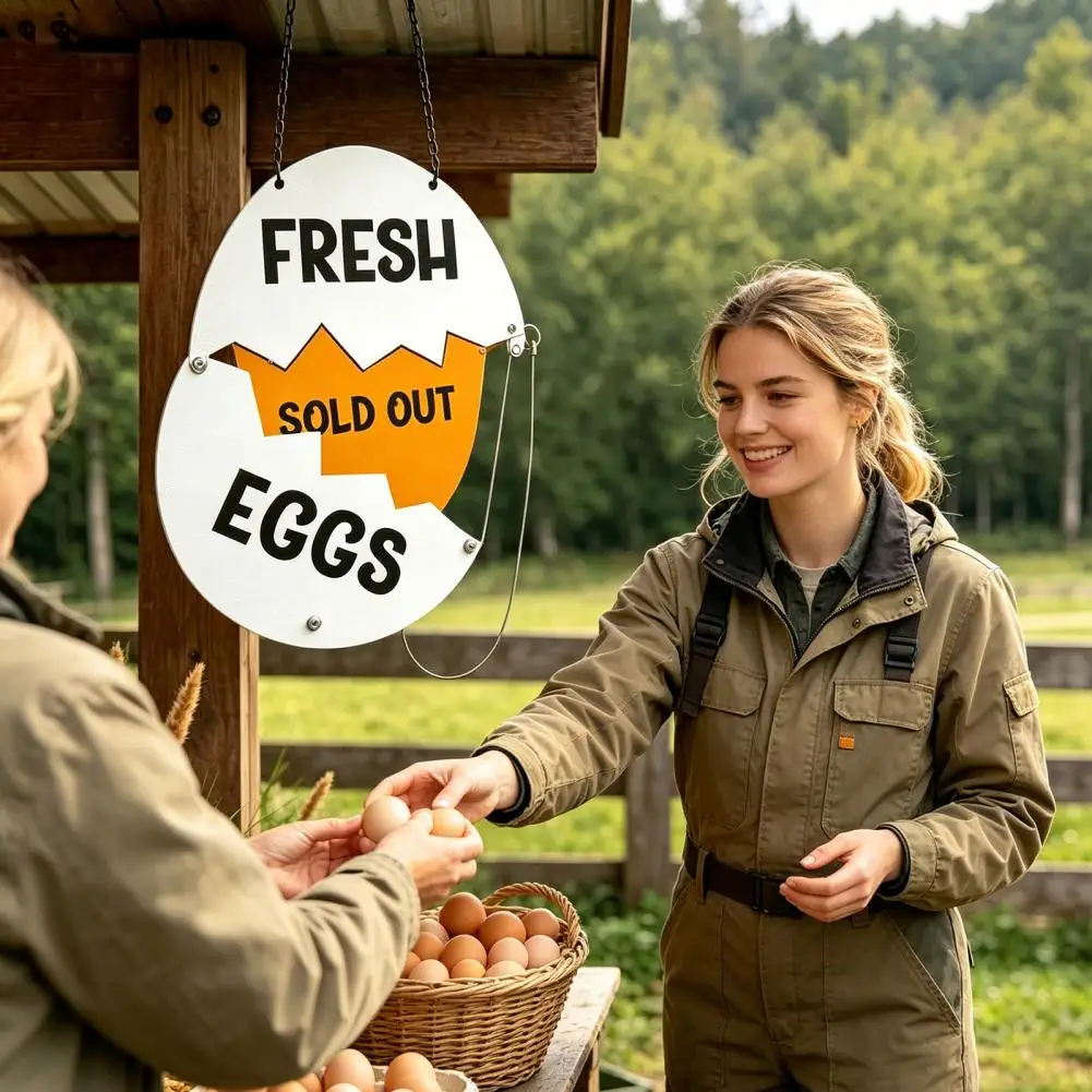 Tabliczka na stoisko z produktem wiejskim, drewniana tabliczka w kształcie popękanej skorupki jajka, zabawna dekoracja wisząca na rynek drobiowy, do ogrodzenia na zewnątrz na farmie.