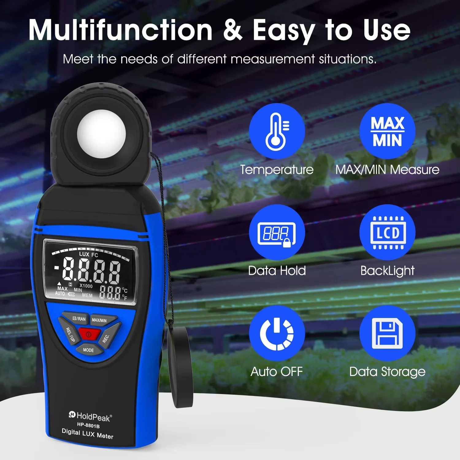 Miernik natężenia oświetlenia do pomiaru wzrostu roślin, model HP-881C, przenośny tester natężenia oświetlenia, zakres pomiarowy od 0,1 Lux do 200 000 Lux