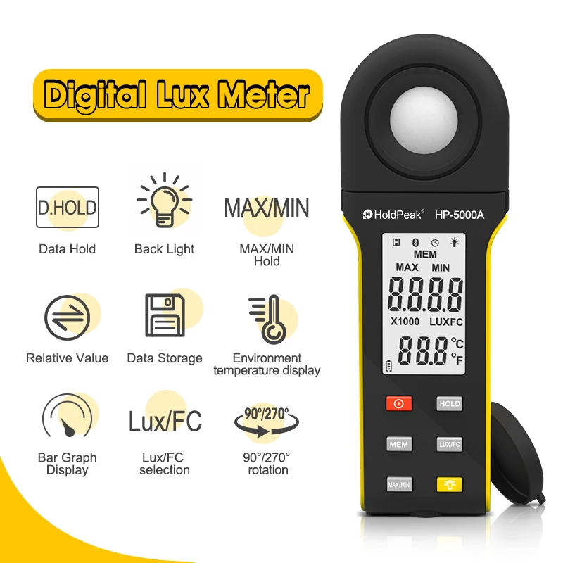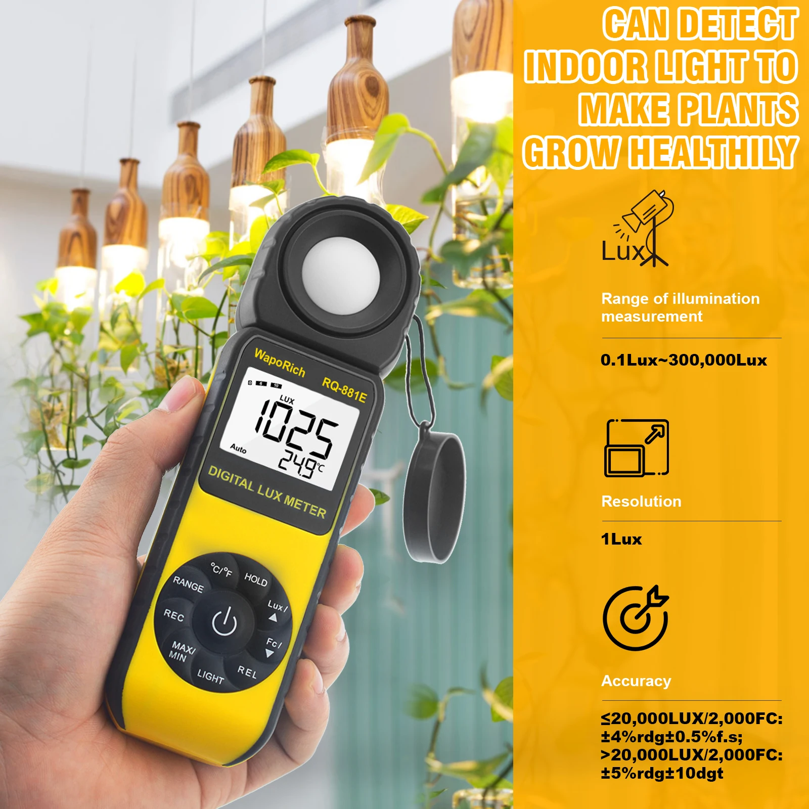 Cyfrowy miernik natężenia oświetlenia HP881E z 270 punktami pomiarowymi ° Obrotowy czujnik, zakres 0,1~300,000 Lux i funkcja rejestracji danych do monitorowania wzrostu roślin i fotografii.