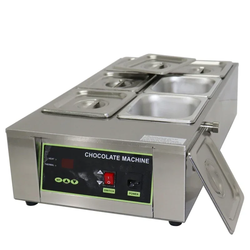 Elektryczny garnek do topienia czekolady, 6 pojemników ze stali nierdzewnej klasy spożywczej z powłoką nieprzywierającą z teflonu, do pieczenia i temperowania.