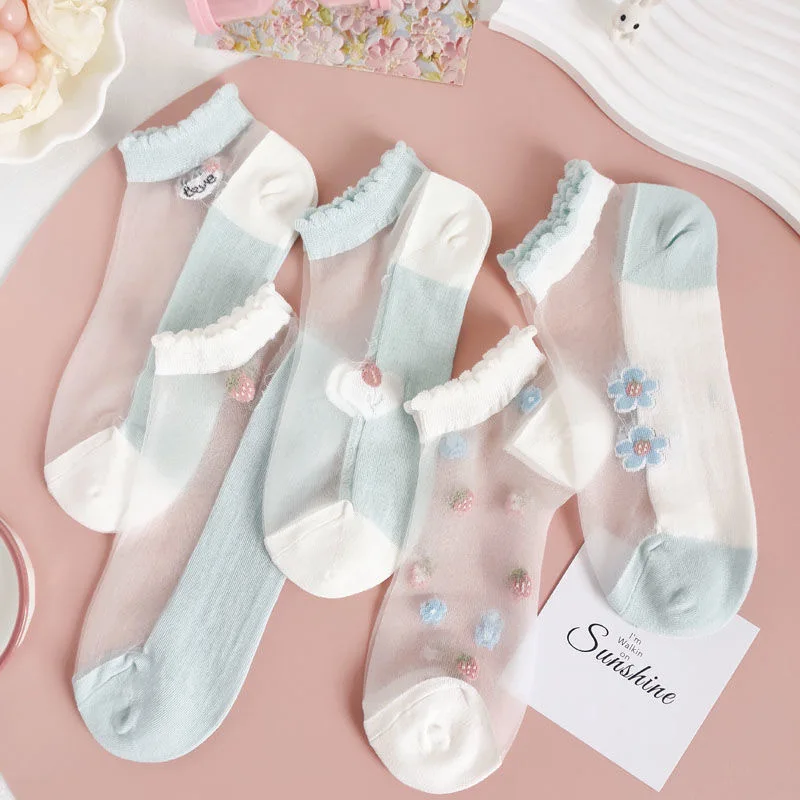 5 par letnich, lekkich i oddychających damskich krótkich skarpetek z włókna szklanego w małe kwiaty Antypoślizgowe silikonowe damskie skarpetki w łódkę