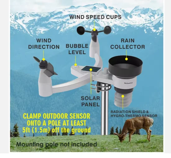 0345 Bezprzewodowa stacja pogodowa 5w1 do użytku wewnątrz i na zewnątrz, pomiar temperatury, wilgotności, prędkości wiatru, opadów, z paskiem, pamięć na dane 5000