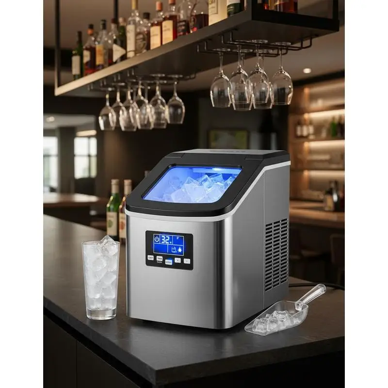 Profesjonalna kostkarka do lodu z pompą, wydajność 59 kg/dzień, pojemność magazynu 15 kg, 45 kostek lodu na cykl, wolnostojąca i kompatybilna z montażem wbudowanym, z wyświetlaczem LED i funkcją samoczynnego odprowadzania wody, do domu, kawiarni i restauracji.