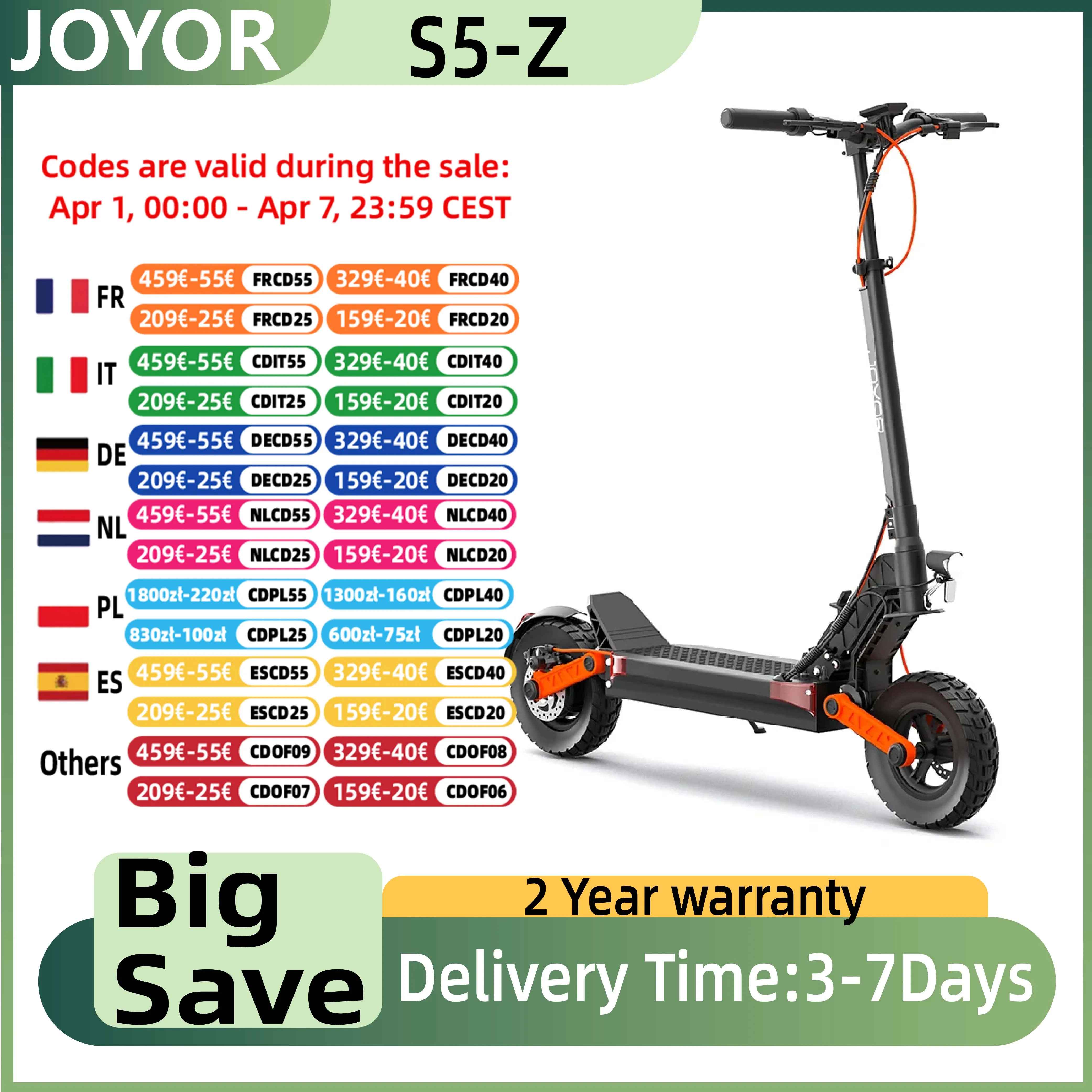 Hulajnoga elektryczna JOYOR S5-Z, bateria 48V 13Ah, silnik 600W, opony 10*3 cali, prędkość 25 km/h, zasięg 40-55 km, hamulce tarczowe przód i tył.