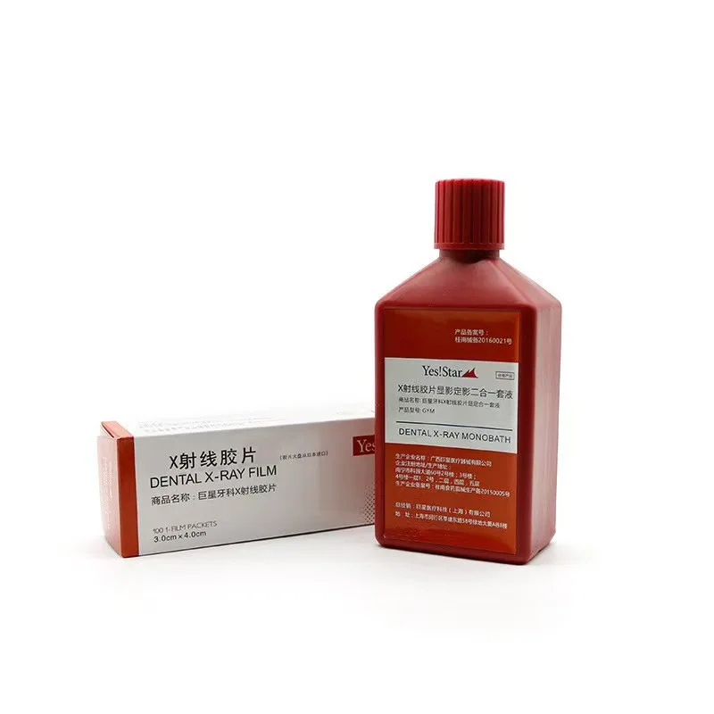 Film rentgenowski Fuji Yes Star X i płynny wywoływacz do rentgena dentystycznego Monobath, płynny wywoływacz dentystyczny do rentgena i film rentgenowski do diagnostyki rentgenowskiej.
