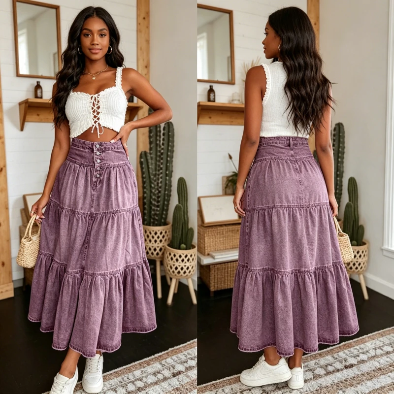 Długa spódnica damska vintage dżinsowa warstwowa spódnica typu cake, zapinana na guziki, z wysokim stanem, sprana, postarzana, damska, w stylu bohemy, linia A, 2026