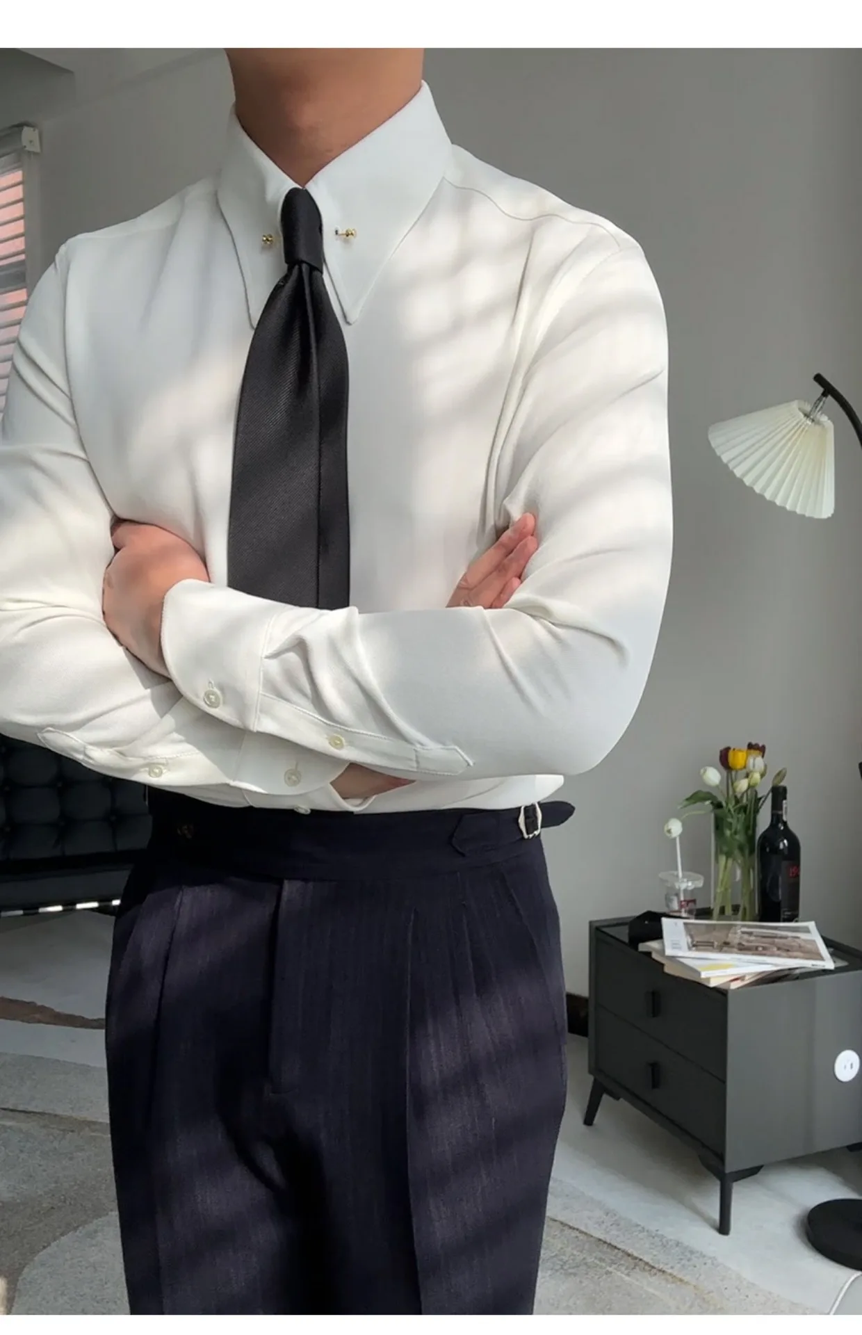 Koszula męska AI NI YA z kołnierzykiem empire, włoski styl retro, kołnierzyk z dziurkowanym wzorem, dopasowany krój slim fit, odzież biznesowa formalna.