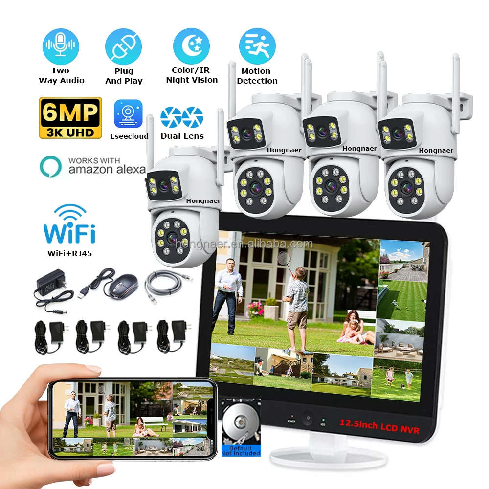 Hongnaer 6MP 4-kanałowy system monitoringu IP z 2 obiektywami, LCD NVR, zestaw kamer bezpieczeństwa CCTV do domu, system Eseecloud WiFi bezprzewodowy IP CCTV