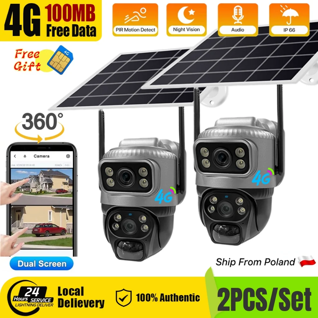 2 SZT. Kamera solarna 4G z 10-krotnym zoomem, podwójnym obiektywem i dwoma ekranami, zewnętrzna kamera 4K z automatycznym śledzeniem, noktowizją, panelem solarnym 8W i baterią 8000mAh