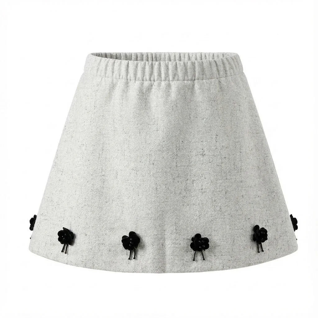 SeasonSea Dziewczęca Szara Spódnica Tweedowa 2025 Jesień Zima Dziecięca Spódnica w Kształcie Litery A z Czarnymi Kwiatami 3D Elegancka Formalna Odzież na Przyjęcia dla Maluchów