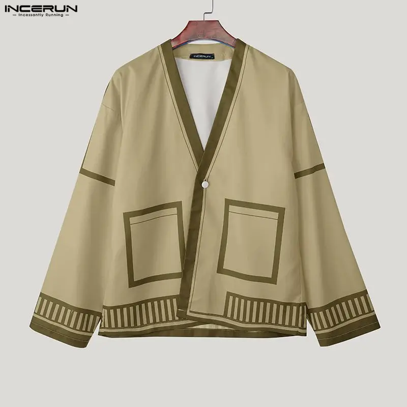 Męska koszulka z nadrukiem Kyudo w stylu japońskim, retro khaki, czarny kot, tribalny wojownik, krótki rękaw, kołnierzyk, jednorzędowa, oversize tunika.