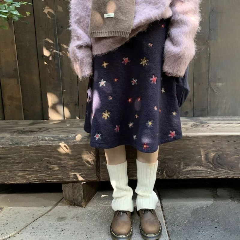 Vintage Urocza Spódnica do Kolan w Stylu Mori Girl z Haftem w Gwiazdy z Wełny Jagnięcej, Jesienno-Zimowa Koreańska Moda, Spódnica Midi w Kształcie Litery A dla Kobiet