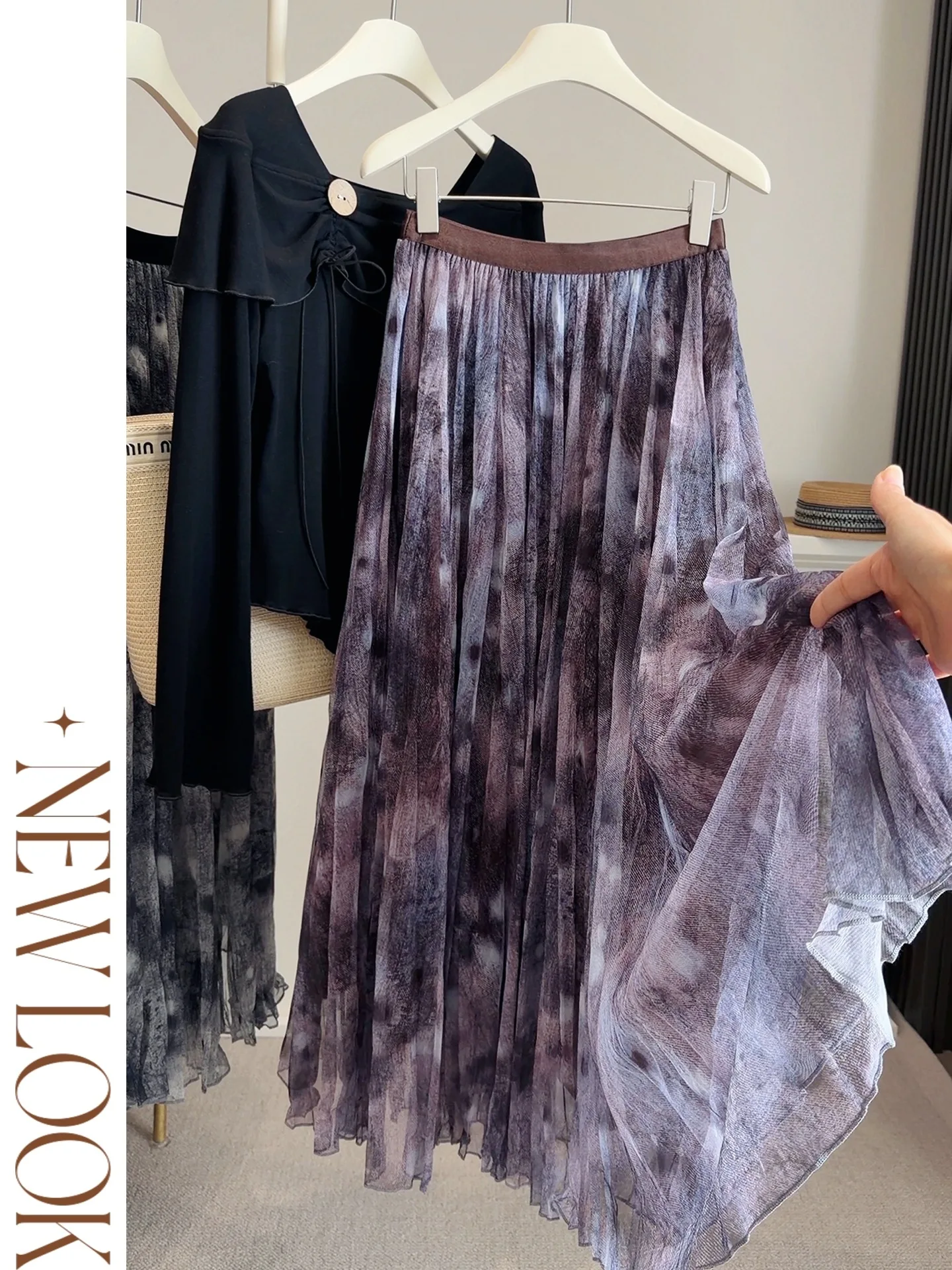 Spódnica damska w stylu vintage z efektem tie-dye, zielona, szyfonowa, o kroju litery A, nowa kolekcja wiosenna, elastyczna, z wysokim stanem, z falbankami, rozkloszowana, Harajuku, plażowa, w stylu fairy.