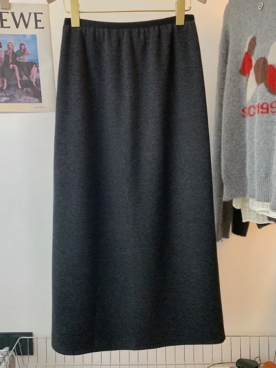 Damska spódnica o długości midi, trapezowa, wełniana, do połowy łydki, na wiosnę, jesień i zimę, wyszczuplająca, z zakładką, z rozcięciem, idealna do pracy.