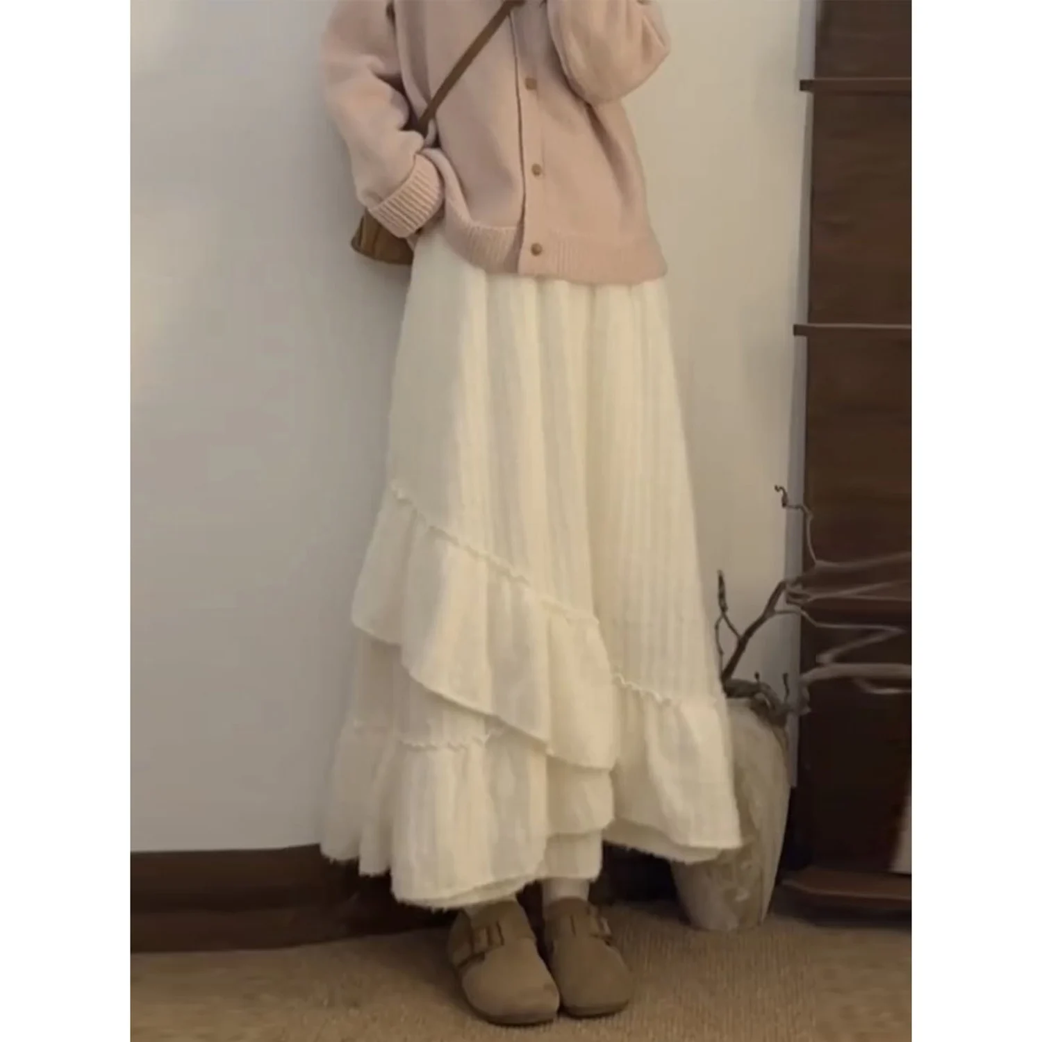 Koreańska spódnica midi z koronką, ocieplana, ciepła, modelująca sylwetkę, spódnica typu cake, damska, do noszenia na co dzień, dopasowany krój, zimowa, nowość 2025